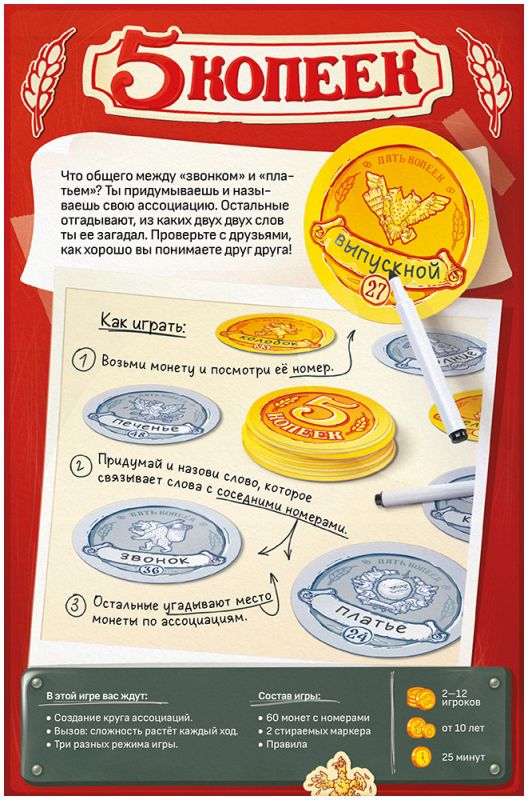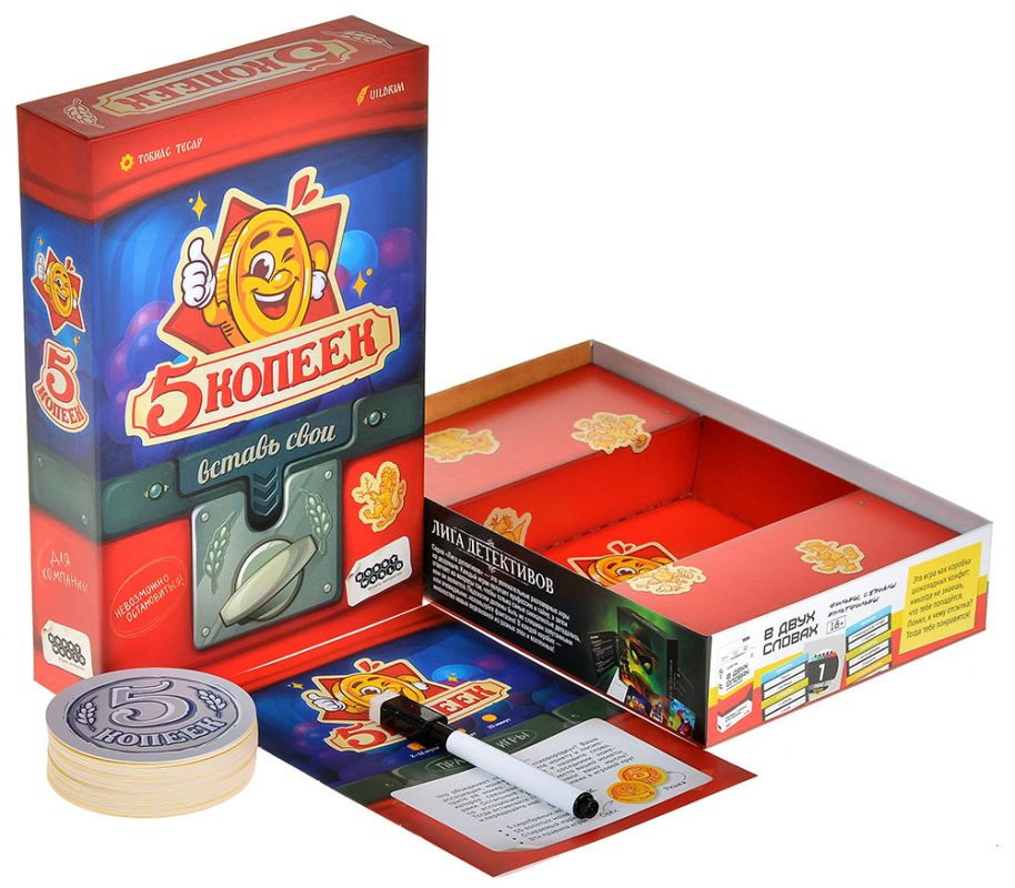 «5 копеек» – лёгкая ассоциативная игра для дружной компании, в которой одна маленькая монета запускает цепную реакцию из подсказок и догадок. Игроки по очереди тайно выбирают число на общем поле, придумывают к нему ассоциации и пытаются сделать так, чтобы другие смогли найти их монету, но не слишком легко. За столом постоянно звучат смех, спорные версии и комментарии в стиле «ну как ты мог это придумать?», а каждая новая подсказка заставляет смотреть на привычные слова под другим углом.