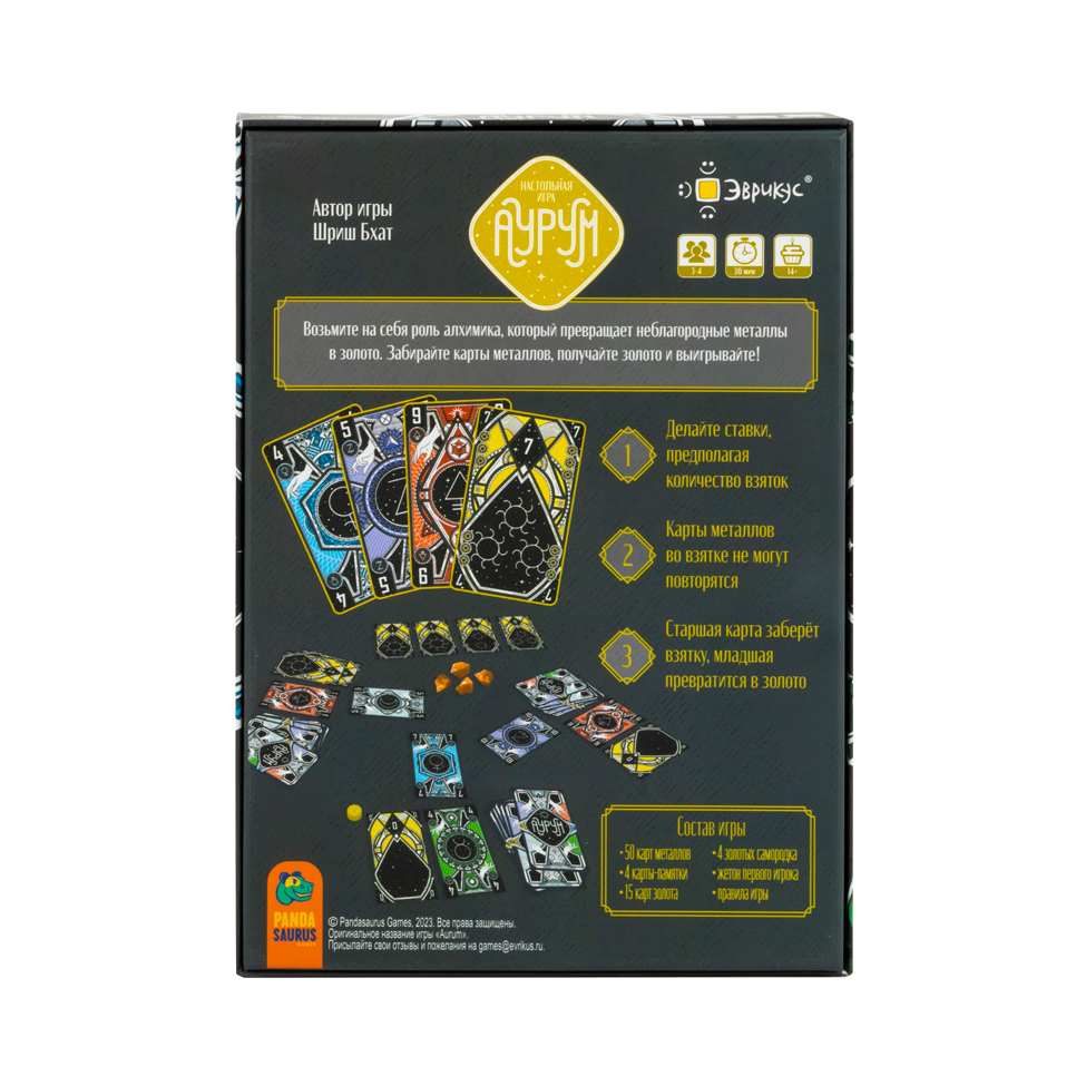 «Аурум» – конкурентная карточная игра на взятки с необычным правилом: здесь запрещено ходить картой уже выложенного металла, а золото побеждает всё. Игроки выступают в роли алхимиков, которые после долгих опытов научились превращать обычные металлы в золото и теперь соревнуются, кто лучше владеет формулой. Очки здесь приносят не только выигранные взятки, но и точные прогнозы – вам нужно заранее заявить, сколько взяток вы возьмёте в раунде, и постараться выполнить эту ставку.