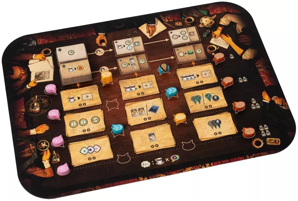 Параллельно вы конкурируете за влияние в ключевых локациях Вены. Фигурка Фрейда и его последователей бродит по городу, посещая кофейни, университетские аудитории и другие значимые места, где можно читать лекции, публиковать монографии или участвовать в собраниях общества. В этих зонах работает механика «мажорити»: кто лучше представлен в определённой локации, получает дополнительную репутацию и доступ к более сильным действиям.