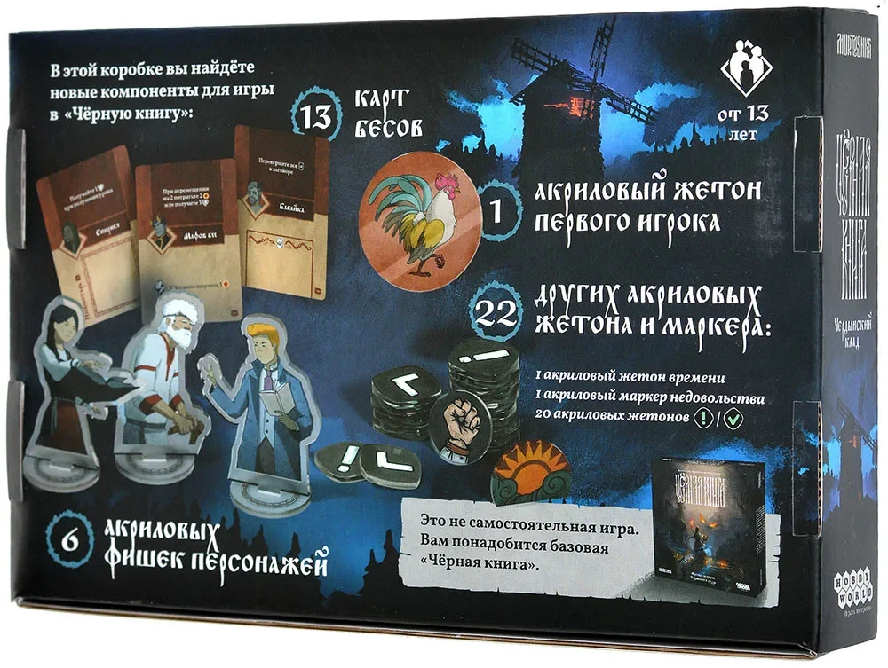 «Чёрная книга: Чердынский клад» – дополнение к атмосфереcкой кооперативной кампании «Чёрная книга», действие которой разворачивается в Чердынском уезде конца XIX века. Базовая игра уже знакомит вас с ролью знатких – колдунов, владеющих силой Чёрной книги, а это расширение углубляет их связь с нечистью и делает оформление партии более «премиальным» за счёт акриловых компонентов.