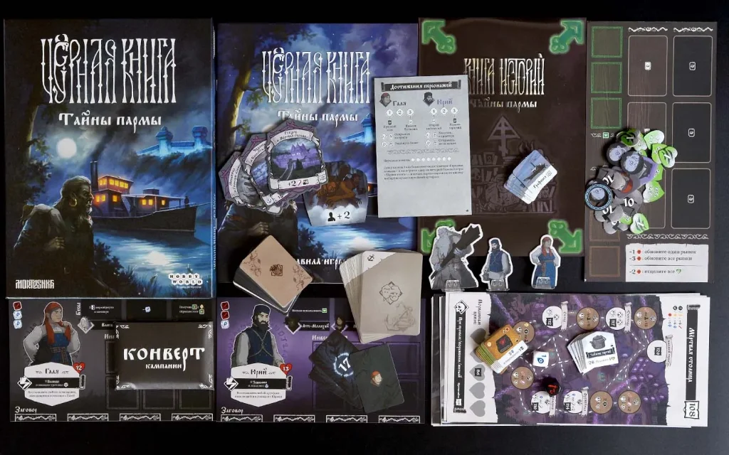 «Чёрная книга: Тайны пармы» – сюжетное дополнение к кооперативной кампании «Чёрная книга», которое продолжает мрачные истории из Чердынского уезда и добавляет новые механики для опытных игроков. В коробке вы найдёте три самостоятельные истории, вдохновлённые уральскими легендами и реальными событиями конца XIX века, а также артефакты, проклятия, ядовитые раны и планшеты приключений, делающие каждое прохождение более напряжённым и вариативным.