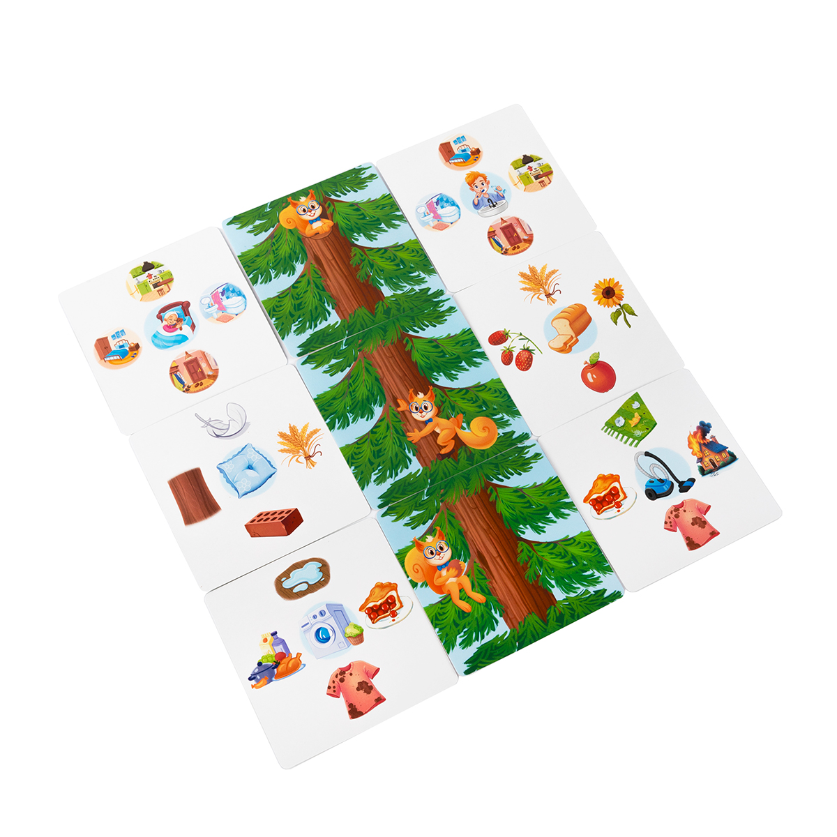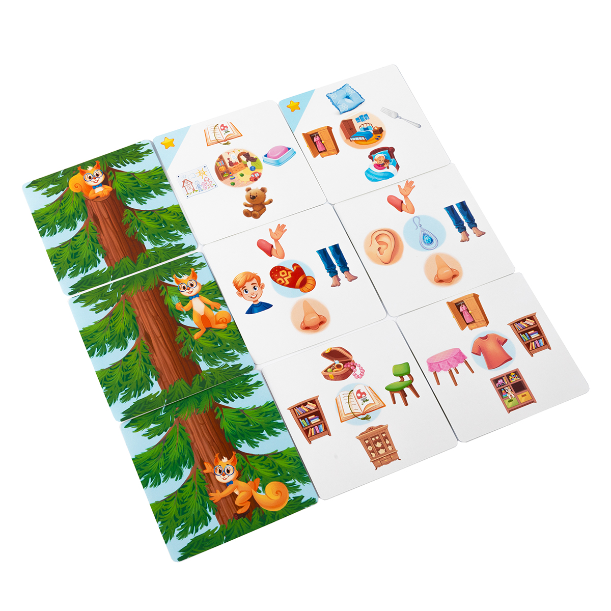 Для ответа ребёнок берёт карточку за сторону с подходящим, на его взгляд, вариантом. Затем карточка переворачивается, и на обороте проверяется результат: если под пальцами спрятался бельчонок, значит, ответ верный, и карточка отправляется в личное «дерево знаний». Все правильно отгаданные карточки выкладываются друг над другом иллюстрацией дерева вверх, так что по ходу игры дерево становится всё выше. Неверный ответ возвращает карточку в низ стопки, давая шанс попробовать ещё раз позже.
