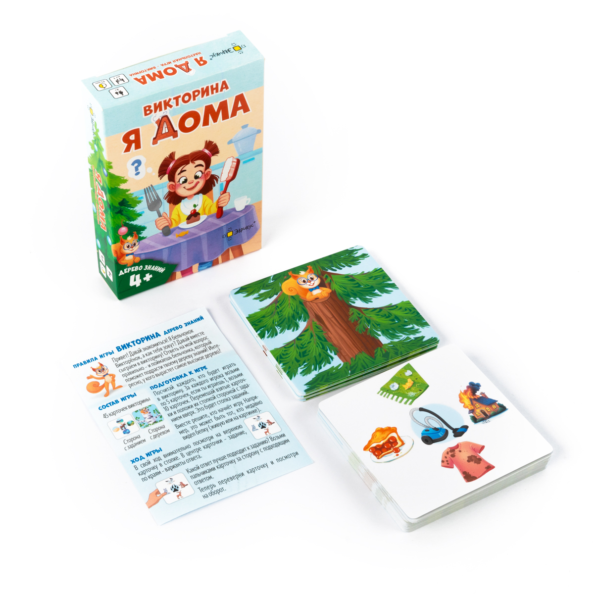 «Дерево знаний: Я дома» — это компактная настольная игра‑викторина для детей от 4 лет, в которой ребёнок знакомится с тем, что его окружает дома, и тренирует внимание, логику и мышление. Вместе с бельчонком Викторёнком игроки отвечают на вопросы о бытовых предметах, домашних делах, одежде и материалах, из которых всё сделано, постепенно выращивая своё дерево знаний из карточек.