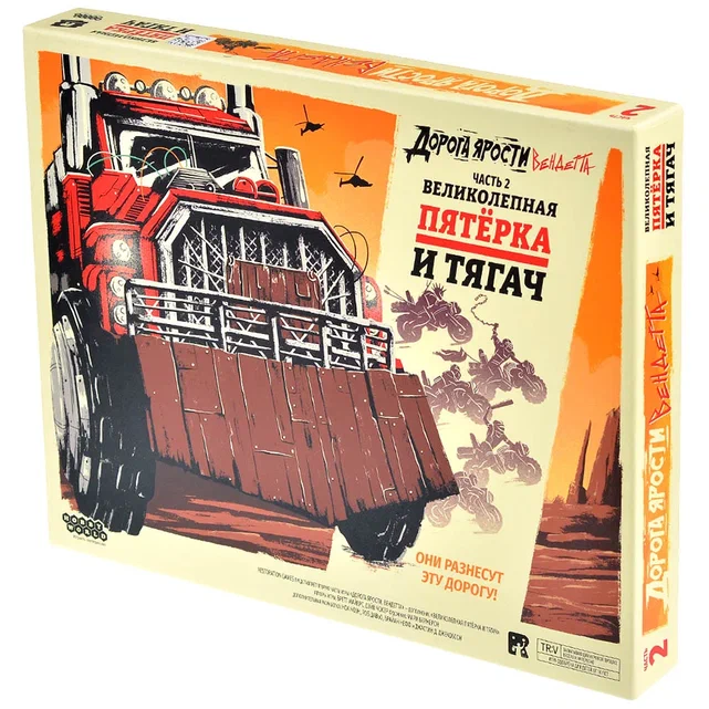 «Дорога ярости: Вендетта. Великолепная пятёрка и тягач» — дополнение к постапокалиптической гонке на выживание «Дорога ярости: Вендетта», которое добавляет в игру ещё больше безумия, скорости и контактного хаоса. В базовой игре игроки управляют бандами головорезов, мчащихся по смертельно опасной трассе, где разрешено толкаться, стрелять и устраивать засады, лишь бы довести хотя бы одну машину до финиша. Это дополнение подбрасывает в топку два новых ярких элемента: массивный автопоезд и отчаянную банду мотоциклистов, что заметно разнообразит партии и добавляет новые тактические возможности.