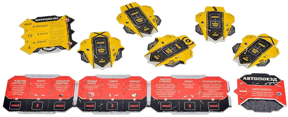 Важную роль в динамике партий играют десять новых кубиков перемещения. Они расширяют вариативность хода и позволяют реализовывать уникальные команды автопоезда и мотоциклов. Для автопоезда это выражается в медленных, но мощных продвижениях, способных сметать с пути тех, кто не успел уйти в сторону. Для мотоциклов — в стремительных рывках, позволяющих вскочить в выгодную позицию или вырваться из потенциально смертельной ловушки. Кубики подчеркивают разницу стилей игры, делая каждый тип техники по‑своему уникальным.