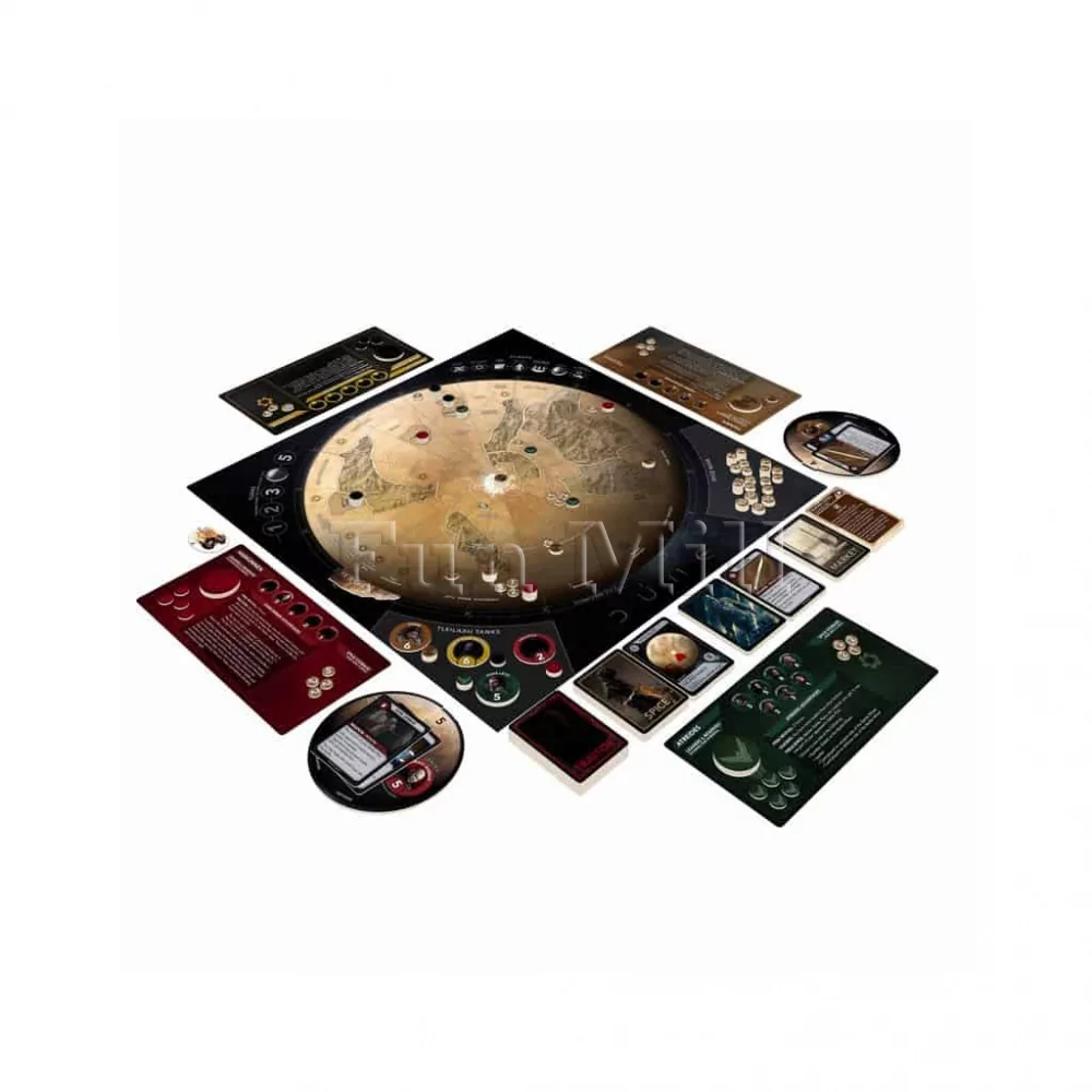 Игровое поле представляет собой карту Арракиса, разделённую на регионы с цитаделями и зонами добычи Пряности. В начале партии на планету высаживаются войска четырёх домов, а маркер бури помещается на трек, определяющий её движение. Игра длится пять раундов, каждый из которых состоит из семи фаз, проходящих в фиксированном порядке: буря, появление Пряности, события с червями, покупка карт, высадка и перемещение войск, битвы и сбор ресурсов. Такая структура делает ход игрока понятным и повторяющимся, но наполнение раундов постоянно меняется за счёт случайных карт и решений соперников.