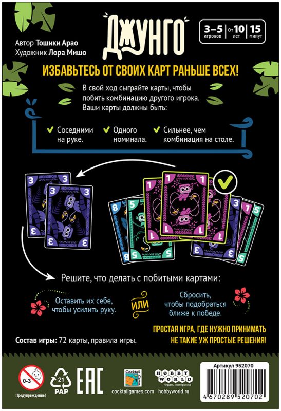«Джунго» – динамичная карточная игра, где цель проста: первым избавиться от всех своих карт, но путь к победе требует аккуратного планирования и немного смелости. Каждый ход приходится решать, что важнее прямо сейчас – усилить руку за счёт побитых карт или сбросить их, сделав шаг ближе к победе.