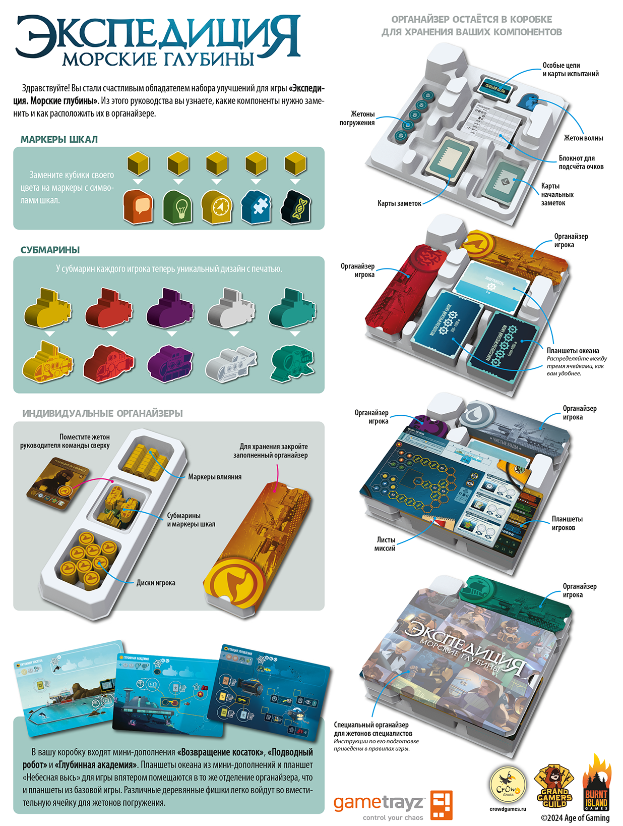 «Экспедиция. Морские глубины» переносит игроков в захватывающий мир подводных исследований, где вы возглавляете независимые институты по изучению и охране океанских экосистем. Каждая партия уникальна благодаря сменным миссиям, которые меняют акватории из 37 локаций, цели и правила. Игроки прокладывают маршруты через рифы и пещеры, нанимая специалистов и развивая их навыки для создания мощных связей.