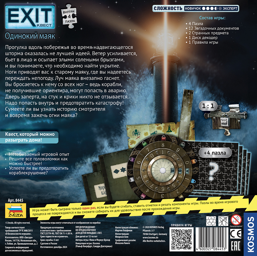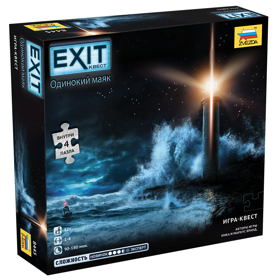 EXIT-Квест: Одинокий маяк — эпизод специальной линейки настольных квестов с пазлами, где загадки скрыты не в картах, а в собираемых изображениях локаций. Вы гуляете по берегу, когда внезапно налетает шторм. Единственная надежда на спасение — старый маяк, луч которого разрывает тьму. Но на ваших глазах свет гаснет, а вдали маячит корабль, несущийся прямо на скалы. Нужно забраться внутрь, найти смотрителя и зажечь прожектор, пока не случилась катастрофа.