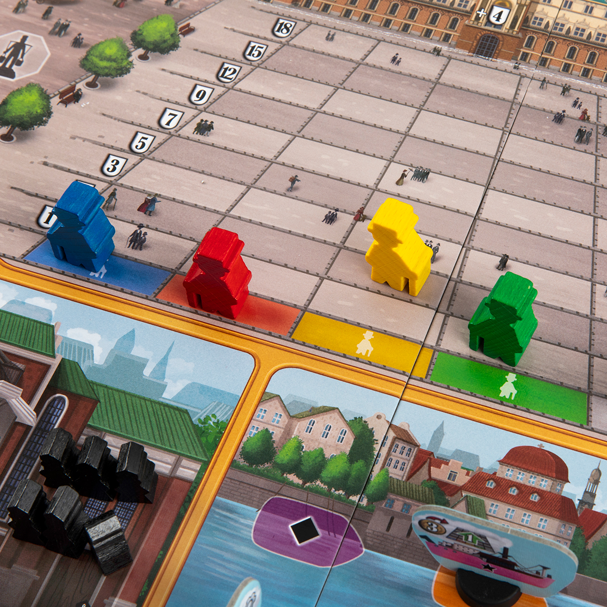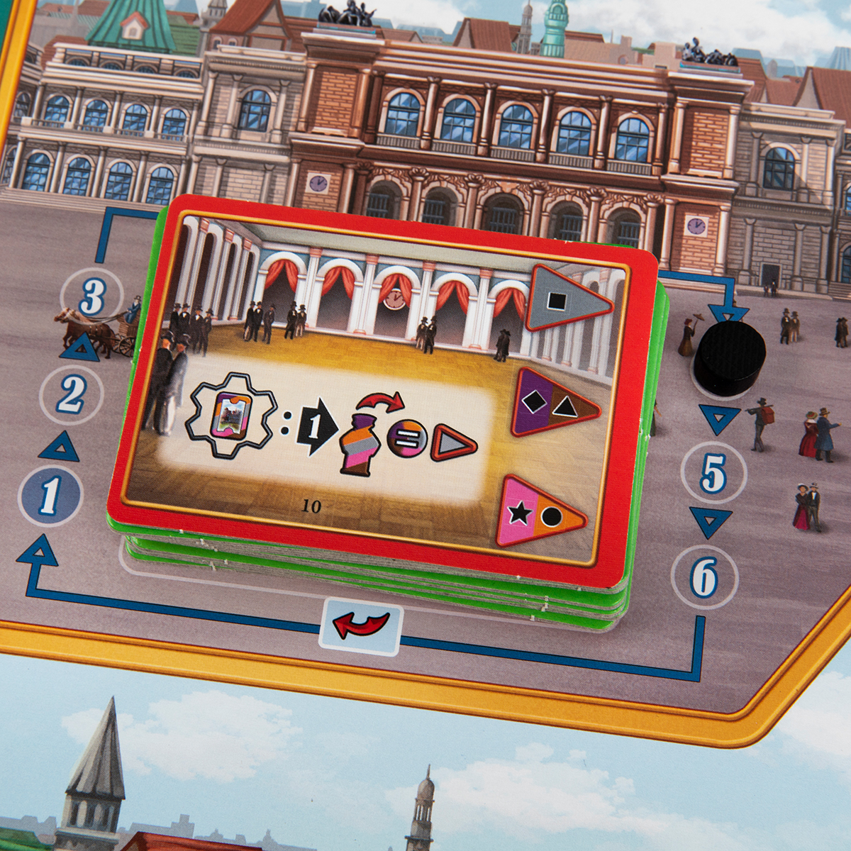 После броска кубиков игроки добирают карты до пяти на руке. «Гамбург» предлагает пятнадцать категорий карт (локаций и персонажей), и каждая карта связана с конкретным местом в городе – от церкви и площади ратуши до портовых строений и жилых кварталов. В свой ход игрок разыгрывает карты по одной, соблюдая цветовые ограничения: каждый раунд он должен использовать пять карт – по одной для каждого из пяти цветов.