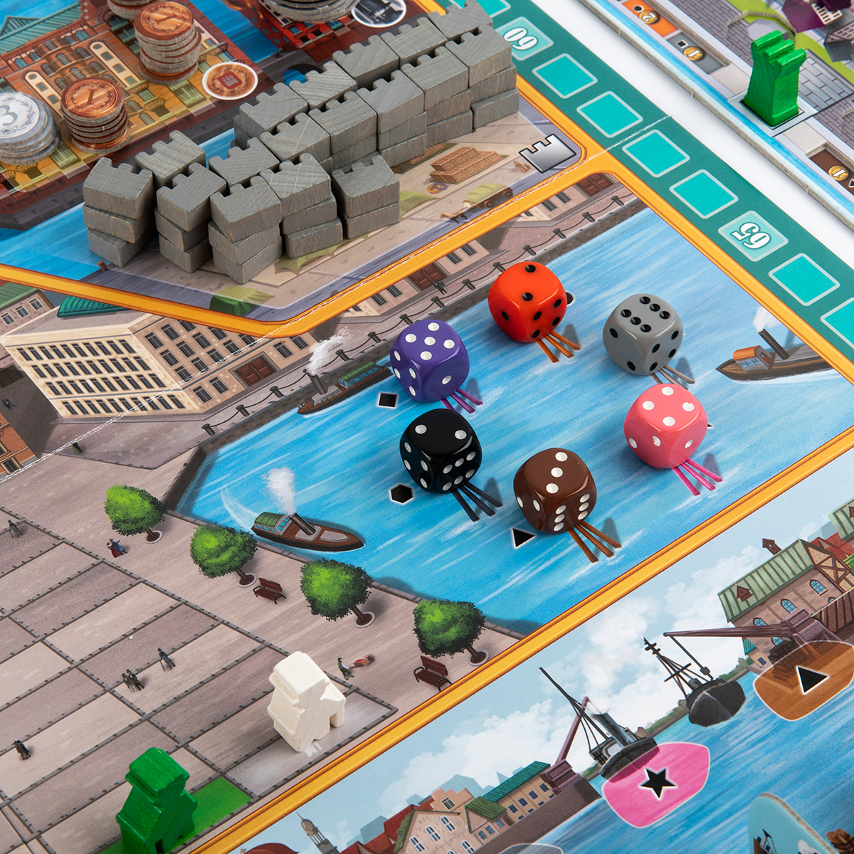 • Взаимодействовать с речным флотом, церковью или треком на площади ратуши, добавляя особые возможности.