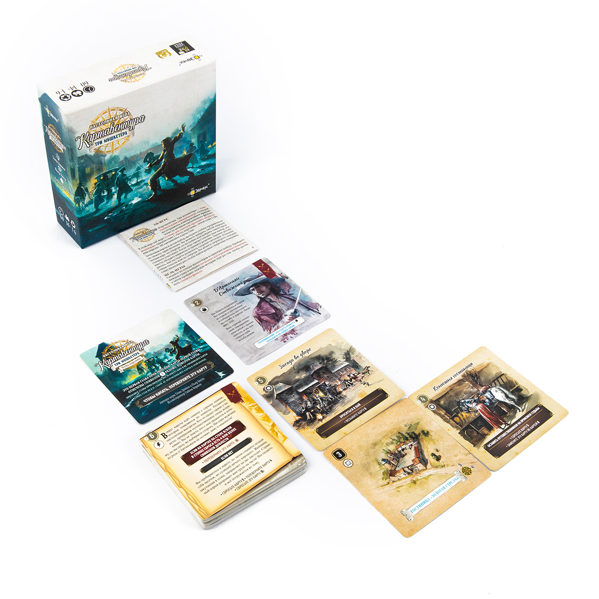 Тематика игры — приключенческая и историческая. В коробке вы найдёте дополнительный буклет с исторической справкой о времени, в которое вас переносит сюжет: Франция времён кардинала Ришельё, придворные интриги, дуэли, честь и долг. Это делает игру не только развлекательной, но и познавательной: после партии хочется перечитать роман или посмотреть экранизацию, чтобы сравнить свой «путь» с классической историей.