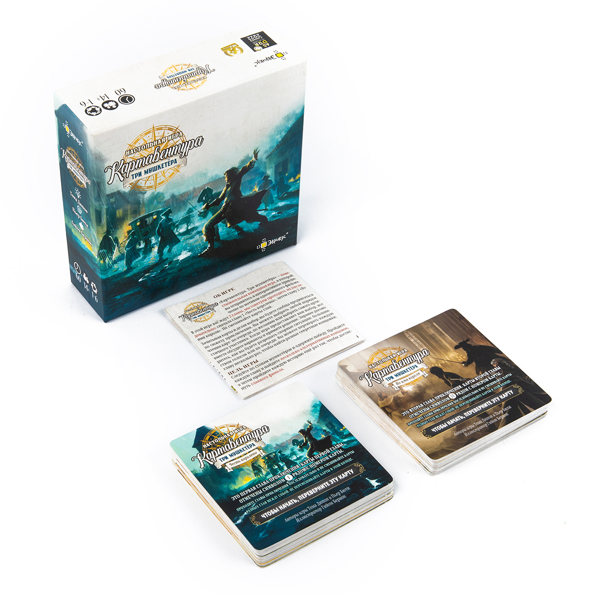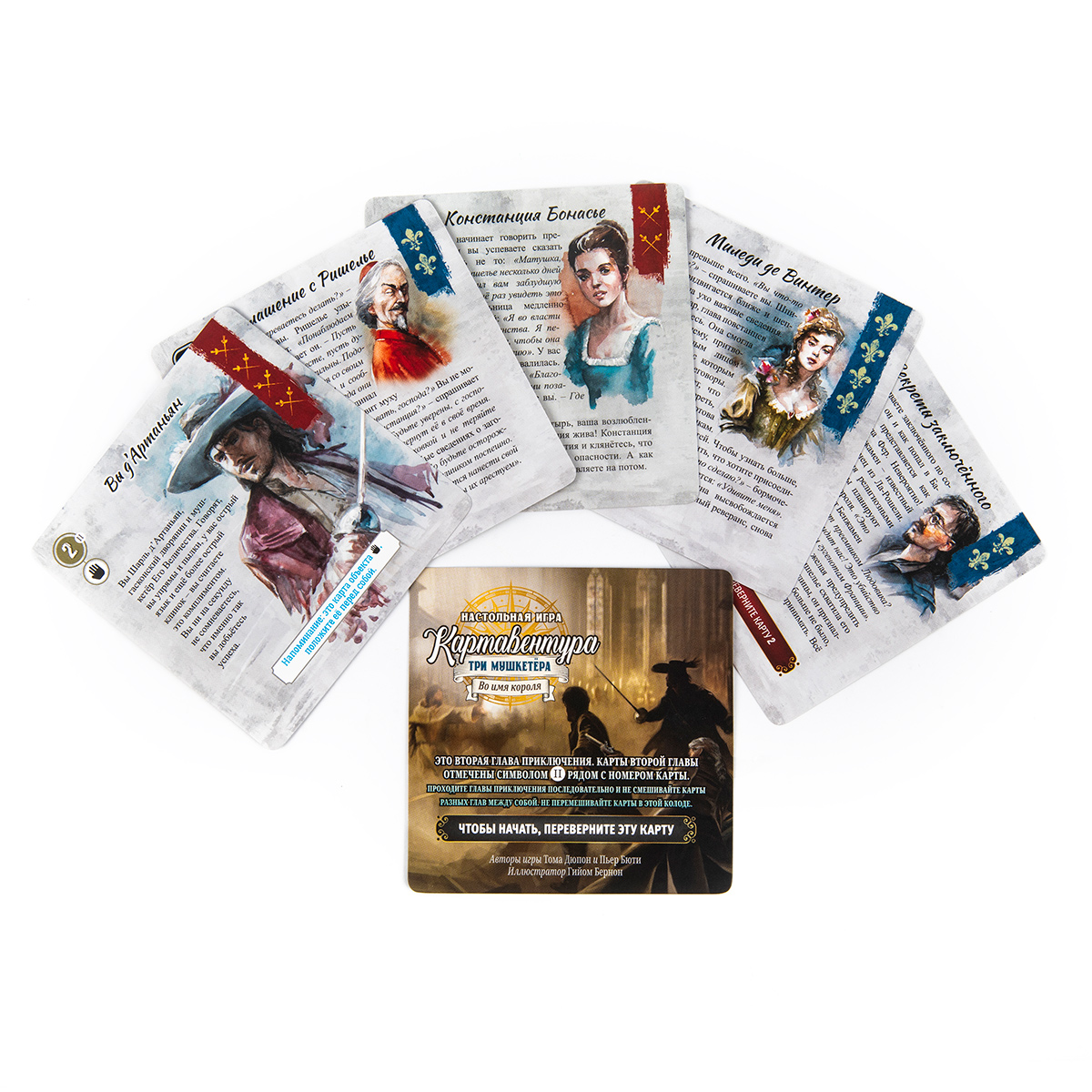 «Картавентура. Три мушкетёра» — настольная повествовательная игра из серии «Картавентура», в которой вы проживаете собственную версию истории знаменитых мушкетёров. Вместо привычного чтения романа вы сами принимаете ключевые решения, определяете ход событий и приходите к одной из нескольких возможных развязок, проходя историю в формате карточной настолки.