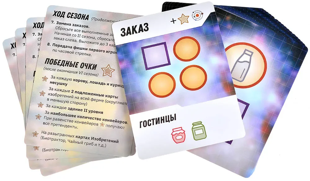 Карты заказов – 18 шт.: требования рынка и специальные цели, приносящие дополнительные бонусы за нужные товары.