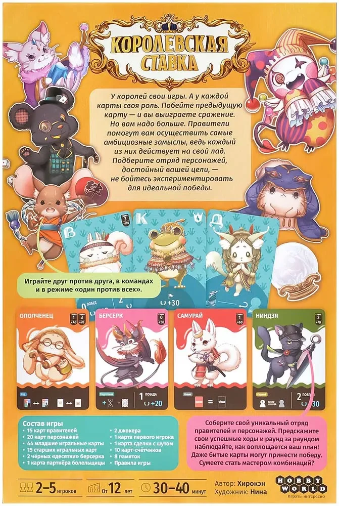 «Королевская ставка» рассчитана на 2–5 игроков и обозначена как стратегическая и хардкорная игра, но её основу составляют знакомые многим механики классических карточных игр. Благодаря этому вступить в партию несложно, а глубина появляется за счёт выбора отрядов, продуманных ставок и умелого использования особых свойств карт. Игра отлично подойдёт любителям «умных» карточных стратегий, поклонникам взятко‑взяток и тем, кто ищет компактную, но напряжённую настолку для компании или дуэльных сессий.