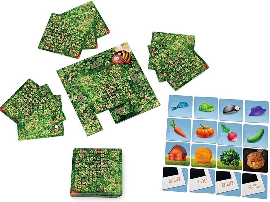 Двухслойный планшет — звезда компонентов: окошко шмеля надёжно показывает подсказки, не раскрывая лишнего. Квадратные карты 85 × 85 мм удобны для маленьких рук, яркие иллюстрации овощей и кротов создают тёплую атмосферу. В соло режиме анализируйте сами, развивая логику без давления.