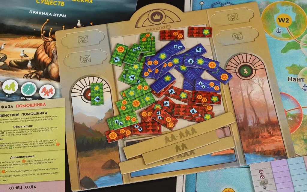 Во фазе помощника акцент смещается с поля на стратегическое развитие. Вы передвигаете помощника по специальному треку инициативы, получая бонусы с кубиков помощника и открывая новые навыки вашего учёного за накопленный опыт. Монеты позволяют выполнять дополнительные действия: менять ставки на криптидов, покупать недостающие доказательства или «перезаряжать» уже использованные навыки. Именно грамотное сочетание полевой работы и апгрейдов помощника помогает выжать максимум из каждого раунда.