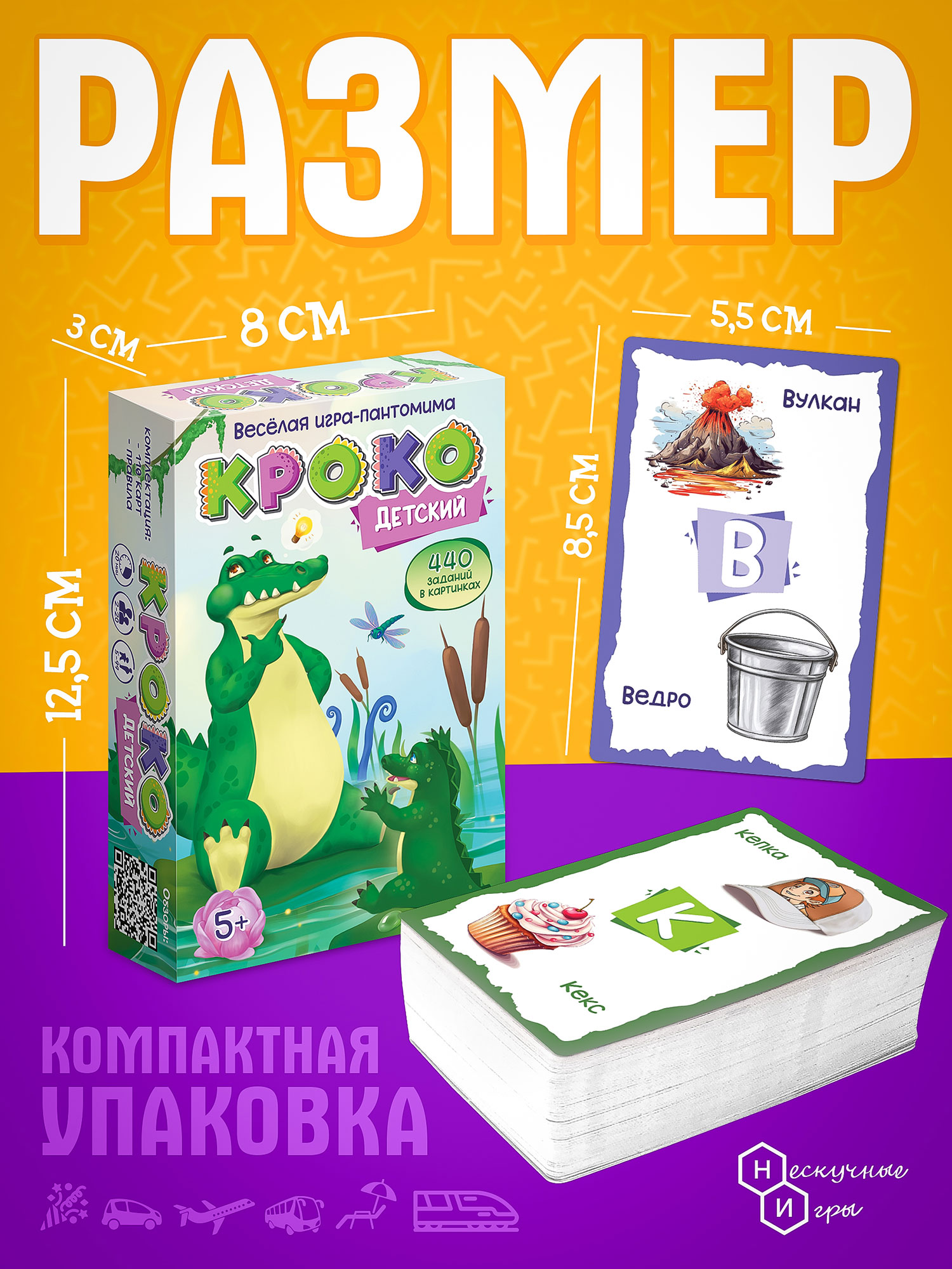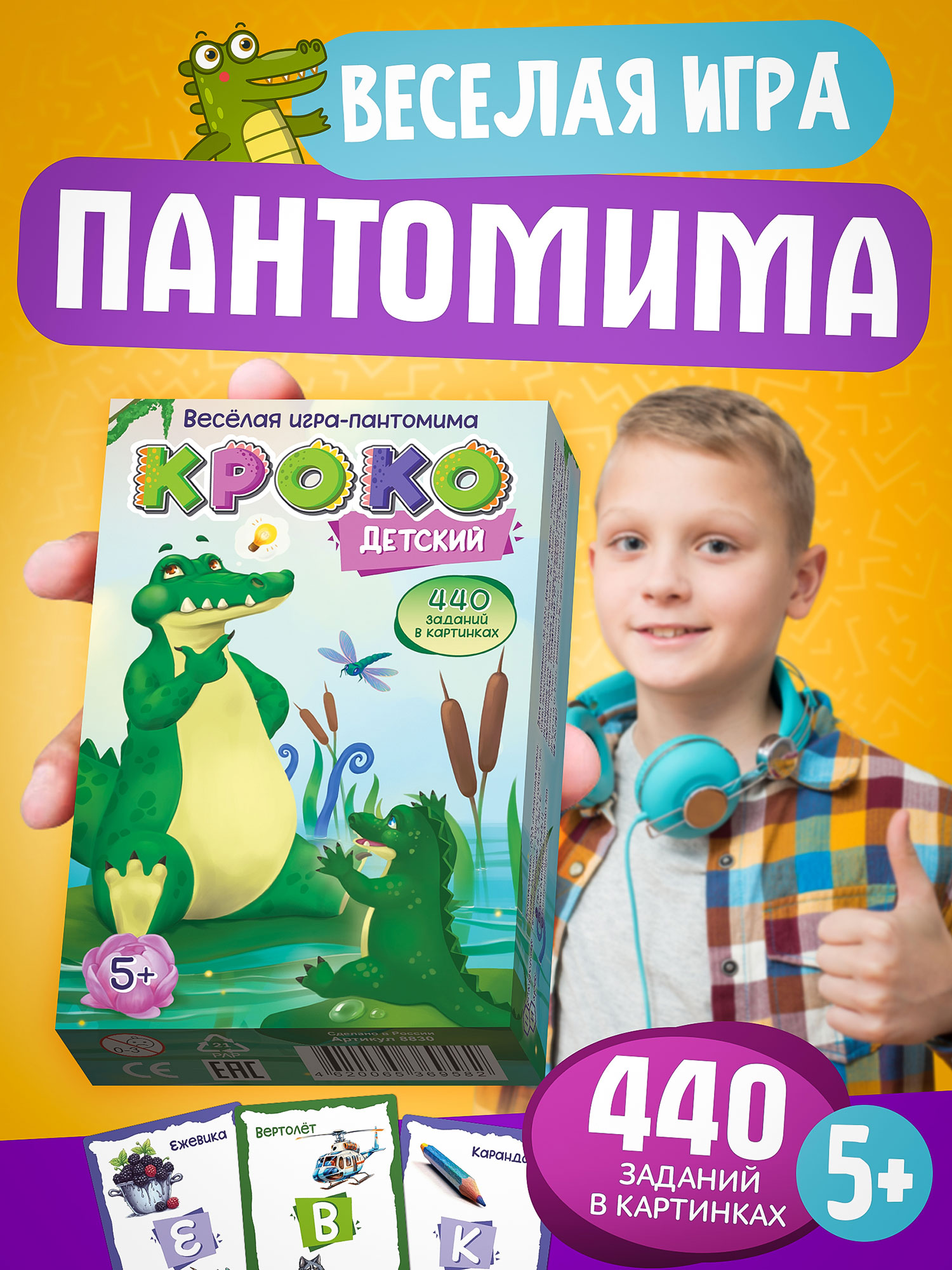 Это весёлая и увлекательная карточная игра Крокодил для детей, которая поможет развить воображение, актёрские способности и умение работать в команде.