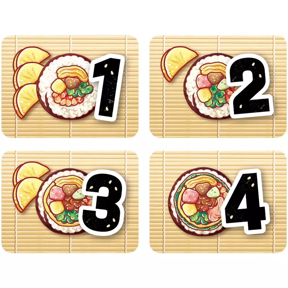 Когда ролл собран, его нужно свернуть и зафиксировать специальной липучкой, превращая плоскую выкладку в аккуратный кимбап. Первый, кто завершит все шаги и уверенно крикнет «Готово!», забирает жетон с наибольшим количеством очков из тех, что лежат в центре. Остальные участники продолжают работу, пока все жетоны раунда не будут разобраны, распределяя оставшиеся награды в порядке готовности.