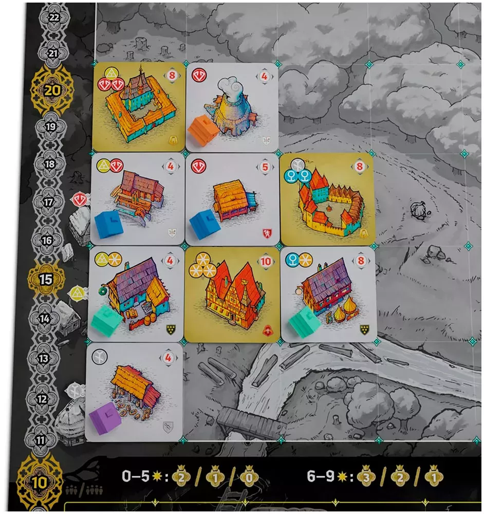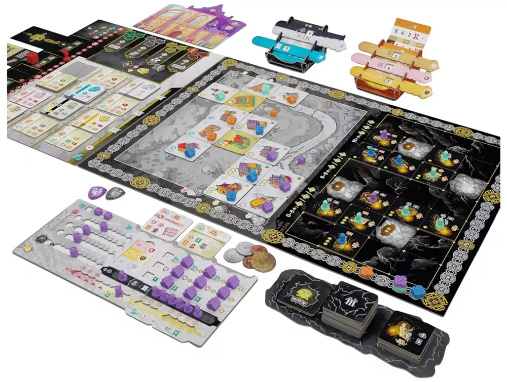 Каждый игрок связан с набором гильдий – асимметричных направлений, вроде горной, ремесленной и строительной. Их возможности и бонусы определяют, какие здания вам выгоднее возводить и какие действия приносят больше пользы, так что уже на старте партии стратегии игроков ощутимо расходятся.
