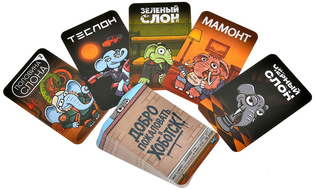 В коробке формата 95 × 125 × 25 мм лежит всего два типа компонентов: 28 карт со Слонярами и правила игры. Карты размера 56 × 87 мм удобно держать в руке; производитель рекомендует защитные протекторы на 28 штук для тех, кто хочет сохранить колоду при регулярной игре.​