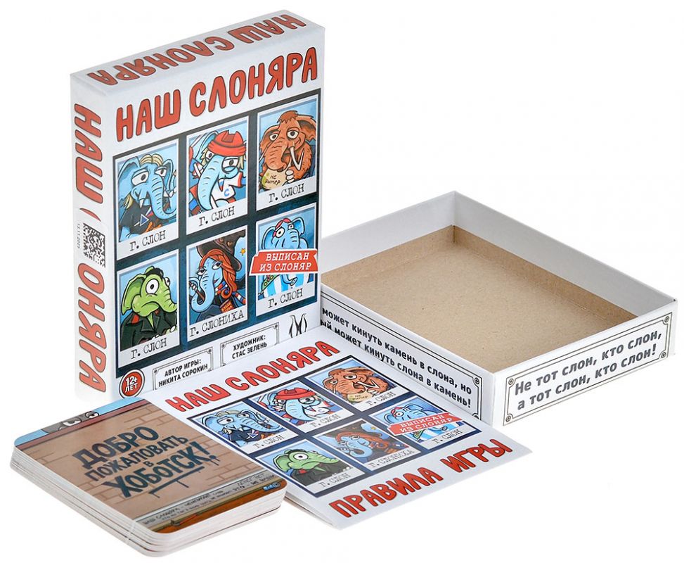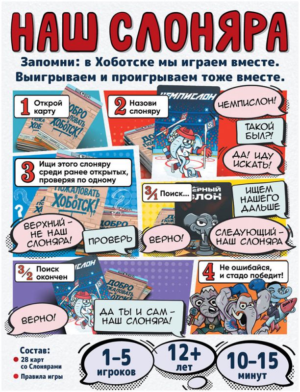 В коробке вас ждут 28 карт со Слонярами с яркими иллюстрациями и именами, которые можно запоминать или придумывать свои. Игровой процесс строится вокруг запоминания порядка карт и командного поиска совпадений, а атмосфера держится на добром юморе и постоянных репликах: «Это наш Слоняра или не наш?».​