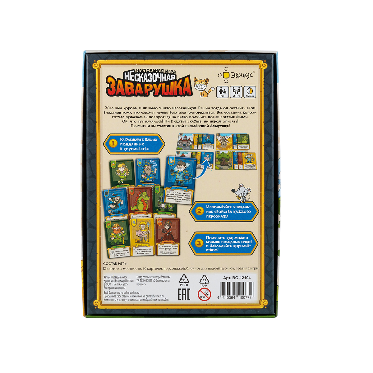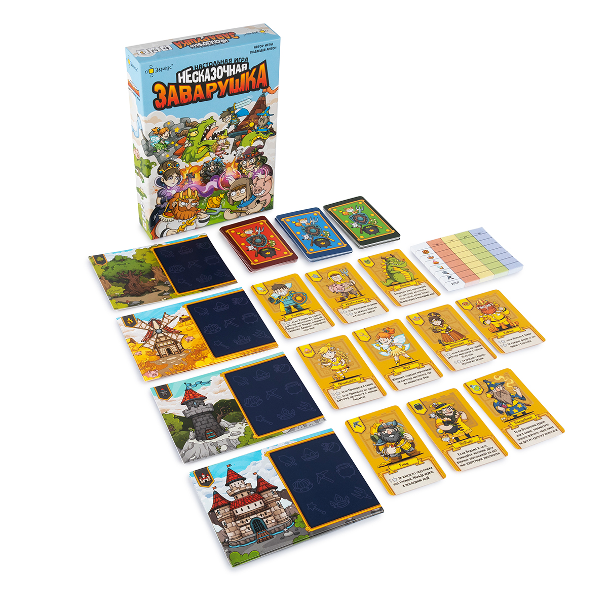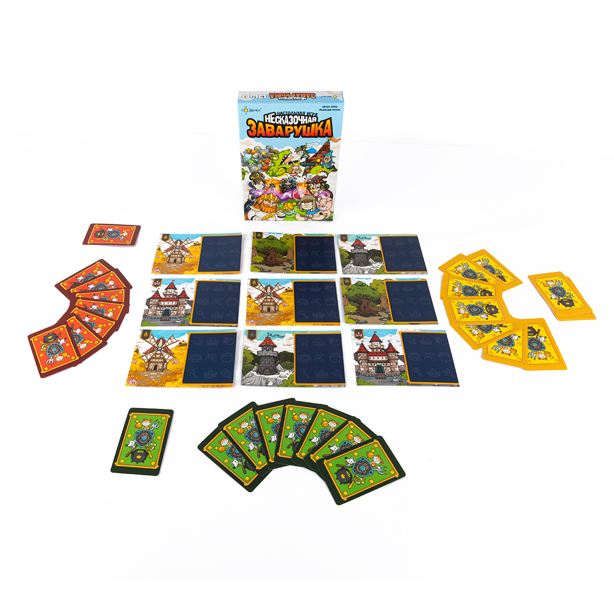 «Несказочная заварушка» – компактная карточная семейная игра, в которой сказочные герои соревнуются за влияние на разных локациях королевства. Вас ждут рыцари и принцессы, драконы и феи, хитрые маги и другие персонажи, чьи способности срабатывают в момент розыгрыша или при финальном подсчёте очков. Игроки стараются разместить свои карты на наиболее выгодных участках местности, использовать магические эффекты в нужный момент и мешать соперникам выстроить идеальные комбинации.