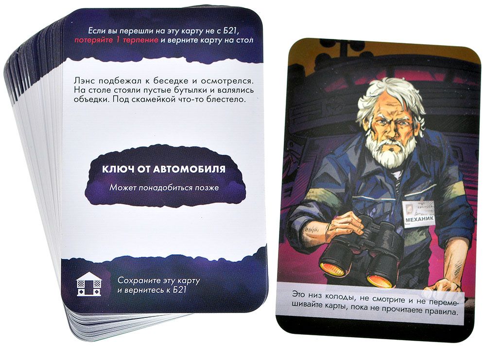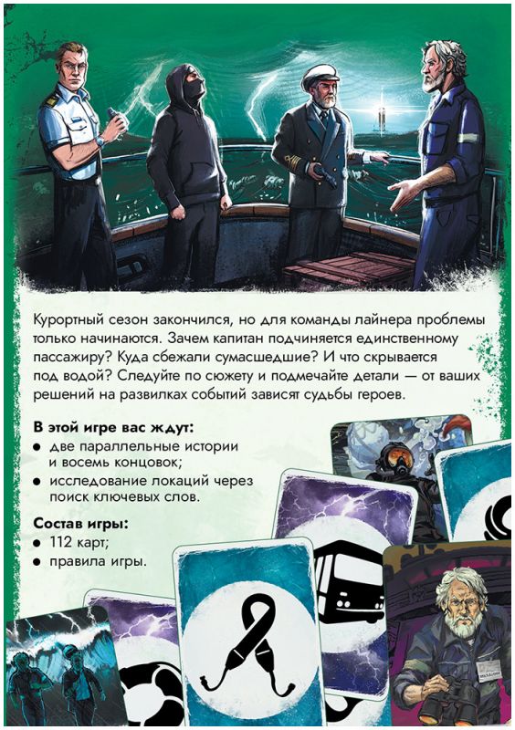 Основой служит колода из 112 карт, с помощью которых вы будете читать сцены, принимать решения и исследовать локации корабля. На картах‑сценах встречаются выделенные ключевые слова – объекты, имена, детали окружения, которые можно «проверить», отыскав соответствующую карту в общей раскладке. Если догадка верна, история продвигается вперёд, открывая новые факты, предметы или варианты действий; ошибка же может обойтись дорого и приблизить одну из неудачных развязок.