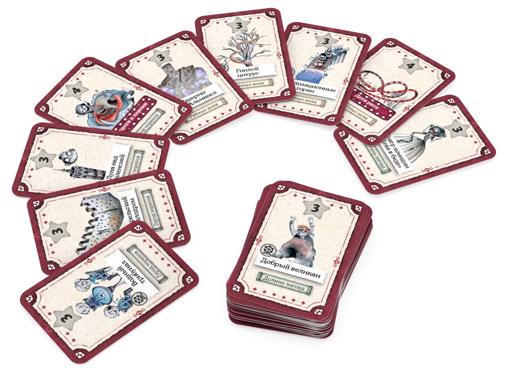 Компоненты яркие: двухсторонние памятки, 10 фишек игроков, колесо. Карты 63×88 мм (29 шт.) и 44×68 мм (84 шт., протекторы рекомендуются). Коробка 265×265×60 мм.