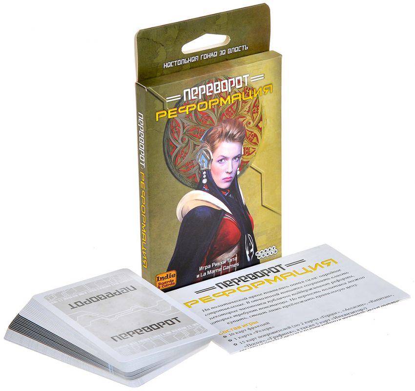 «Переворот: Реформация» – дополнение к культовой карточной игре на блеф и влияние «Переворот», которое вносит в привычный расклад новый уровень политического раскола. Из‑за успехов сопротивления город больше не единое коррумпированное болото: улицы и площади разделены агитацией двух лагерей, а игрокам приходится выбирать сторону и манипулировать уже не только личной властью, но и лояльностью к фракции.