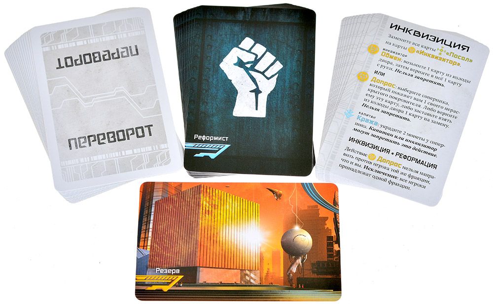 Важно: это не самостоятельная игра. Для использования дополнения требуется базовая версия «Переворот», в которой находятся основные карты персонажей, монеты, жетоны влияния и полный набор базовых ролей. «Реформация» расширяет уже знакомую колоду и добавляет новые режимы – в том числе возможность командной игры с фракциями при сохранении единоличного победителя.
