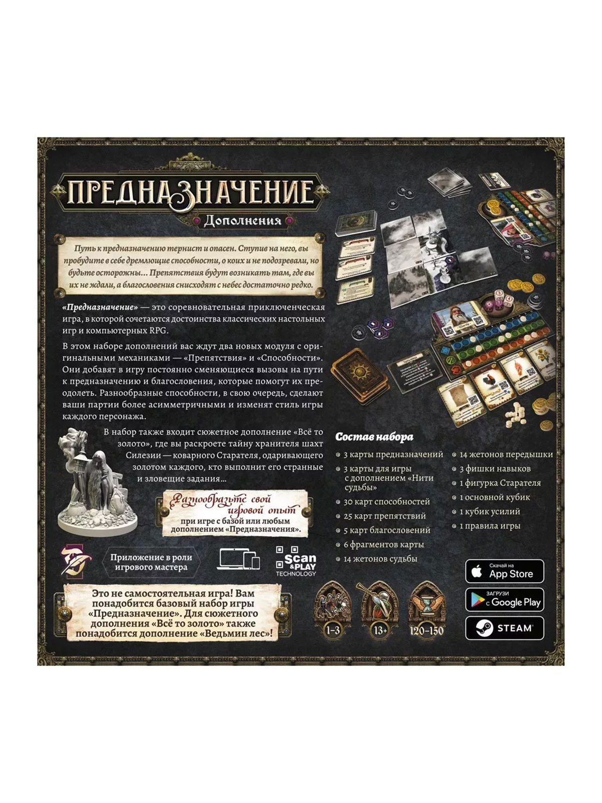Набор «Предназначение. Дополнения "Ведьмин лес: Всё то золото", "Препятствия", "Способности"» расширяет мир приключенческой игры «Предназначение» и её кампании «Ведьмин лес», добавляя к ним новые испытания, сюжет и уникальные навыки персонажей. Это три модуля в одной коробке: два механических («Препятствия» и «Способности») и одно сюжетное дополнение («Всё то золото»), которые можно комбинировать между собой и с другими коробками серии.