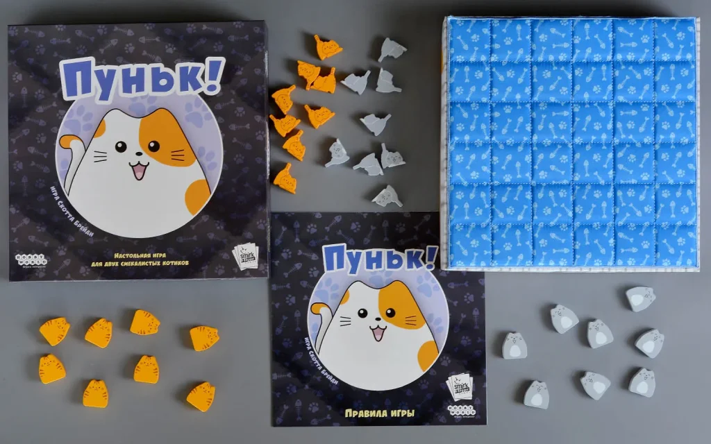 «Пуньк!» – очаровательная дуэльная настольная игра, в которой два игрока сражаются за мягкую кровать, усыпанную котятами и котами. Игровое поле оформлено в виде стёганого одеяла, а вместо привычных абстрактных фишек здесь – милые фигурки пушистых хвостатых. Ваша цель проста и забавна: первым выстроить ряд из трёх взрослых котов или разместить на одеяле всех своих котов одновременно, превратив кровать в личный кошачий трон.