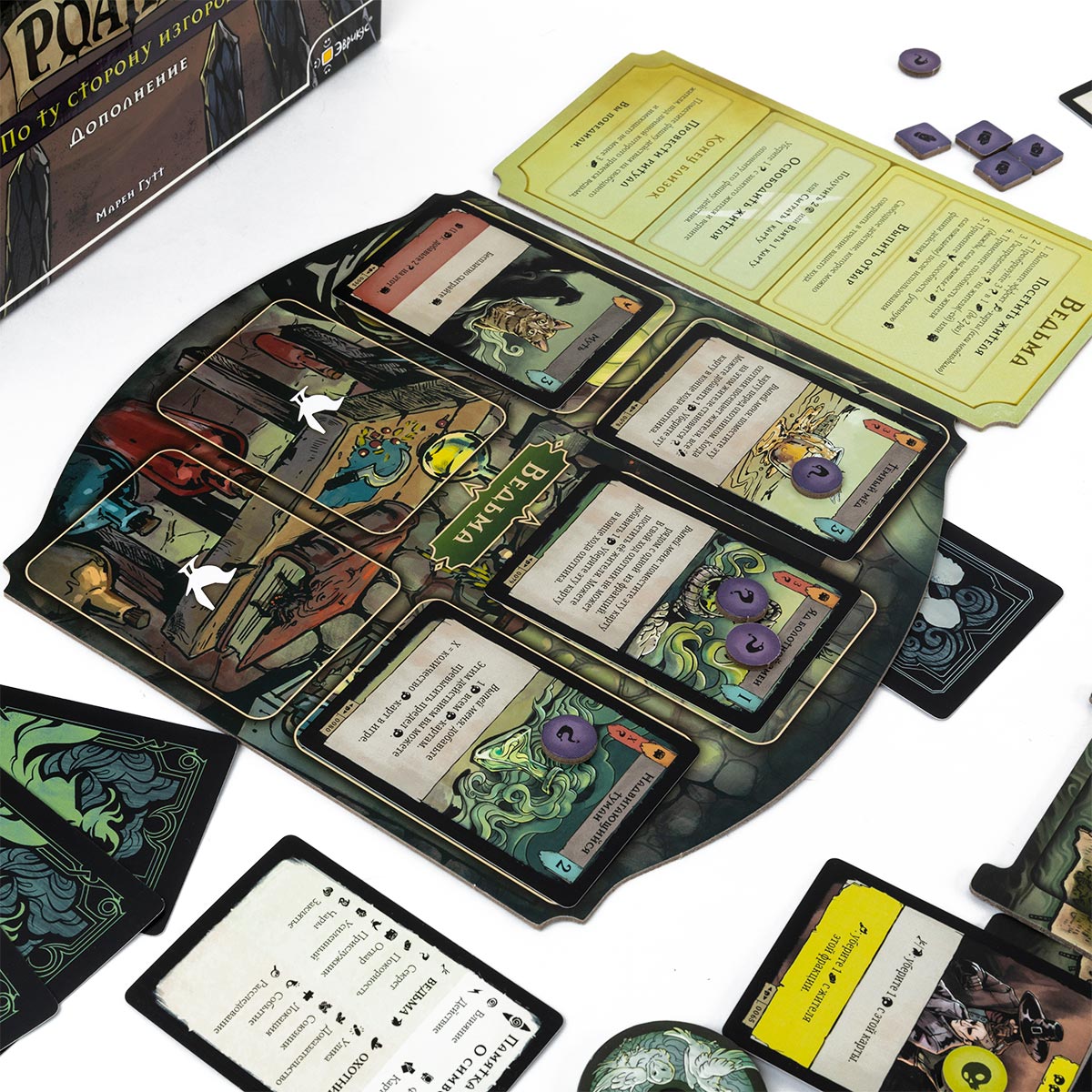 Главное нововведение — мрак и очищение. Мрак представлен отдельными жетонами, которые размещаются на картах с соответствующим символом. Пока жетоны лежат на карте мрака, ведьма получает от неё дополнительную выгоду: усиливает свои чары, накапливает ресурсы или расширяет влияние. Как только охотник с помощью карт и действий убирает с такой карты последний жетон мрака, он сразу должен применить эффект очищения, после чего карта сбрасывается из игры. Таким образом каждая карта мрака — это временный, но мощный источник силы для ведьмы и потенциальный трофей для охотника.