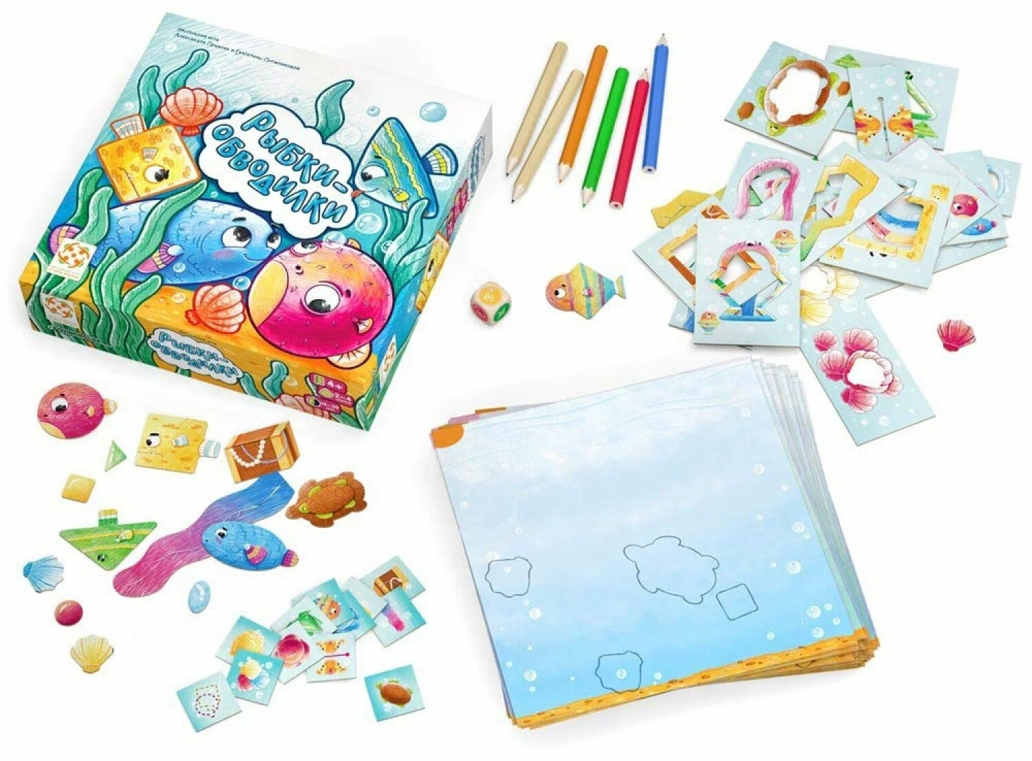 «Рыбки-обводилки» — творческая развивающая игра, где дети становятся дизайнерами аквариумов, обводя трафаретами симпатичных рыбок и выполняя условия по их содержанию. Каждый игрок обустраивает личный аквариум на игровом поле, размещая обитателей, кормя их любимой едой и украшая водорослями. Игра сочетает рисование, выполнение заданий и подсчёт очков, идеально подходит для 2–4 детей от 4 лет, партии длятся 15–30 минут.