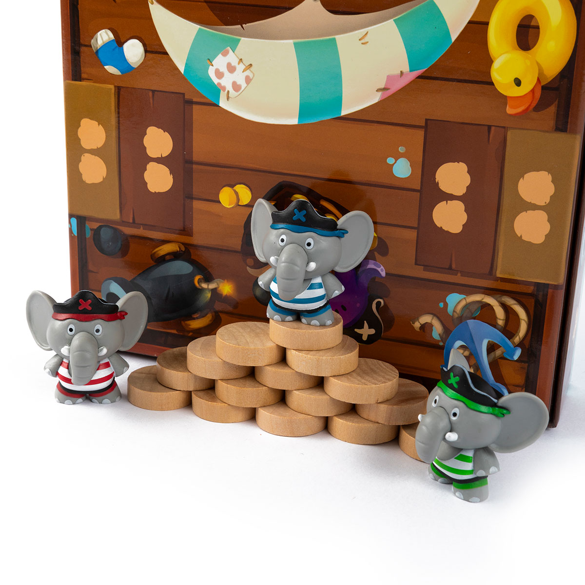 «Слоны-пираты» – динамичная детская настолка, в которой каждый игрок управляет забавным слоном-пиратом, рискующим ради сокровищ на палубе корабля капитана Жирафа. По сюжету вы – команда смельчаков, решивших стащить как можно больше сокровищ с пиратского корабля, но любое неверное движение может закончиться падением в воду. В игре много смеха, шума и эмоций: дети радуются удачным открытиям, переживают за шатающиеся доски и с азартом следят, чей слон продержится дольше всех.