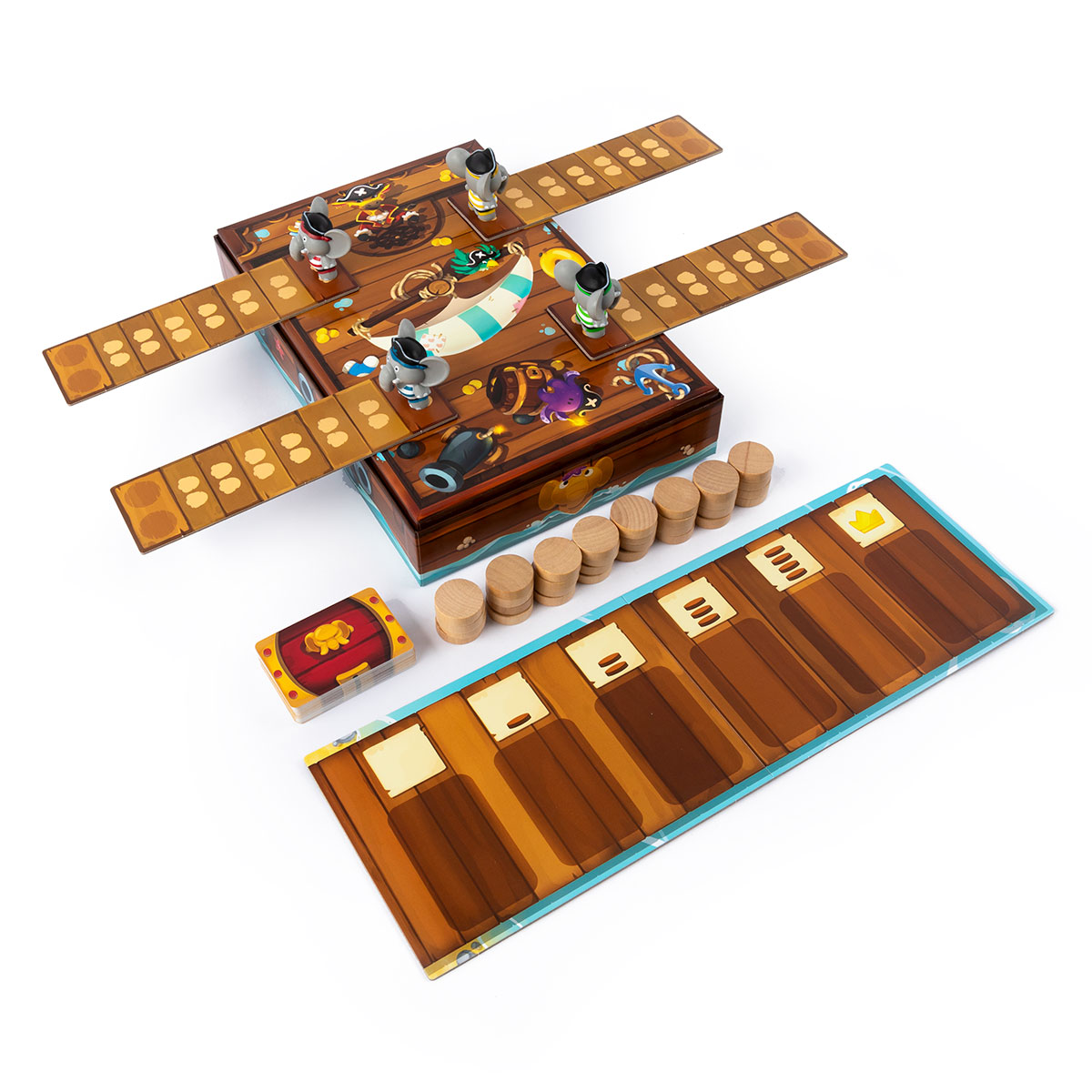 Игровое поле устроено необычно: коробка игры превращается в палубу корабля с магнитным дном, к которому крепятся доски с фигурками слонов. У каждого игрока есть своя магнитная доска, уходящая от борта корабля над «водой», и фигурка слона-пирата, постепенно продвигающегося всё ближе к краю. На стол также выкладывается планшет пристани – сюда будут попадать открытые карты сокровищ, за которые соперникам придётся платить тяжёлыми ящиками.
