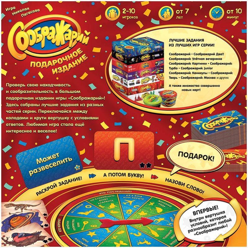 Подарочное издание позиционируется как «лучшее из Соображария в одной коробке»: здесь есть задания и идеи из «Соображарий», «Соображарий Два», «Улётная вечеринка», «Картинки», «Турбо», «Junior», «Каникулы», городских выпусков и других тематических версий, плюс множество новых карточек. Это делает коробку удобной точкой входа в серию: можно сразу получить богатый набор заданий вместо покупки нескольких отдельных коробок.