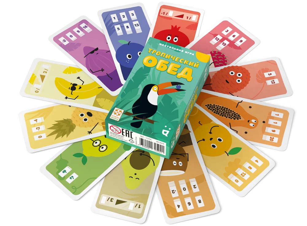 «Тропический обед» — лёгкая карточная игра, где туканы в знойном лесу ищут идеальные фрукты для перекуса под пальмой. Палящее солнце заставляет быть избирательными: собирайте карты плодов в наборы, чтобы набрать максимум очков за комбинации. Продумывайте ходы, опережая соперников за сочными бананами, ананасами и манго. Игра для 2–4 человек от 6 лет длится 15 минут, идеальна для семей и путешествий.
