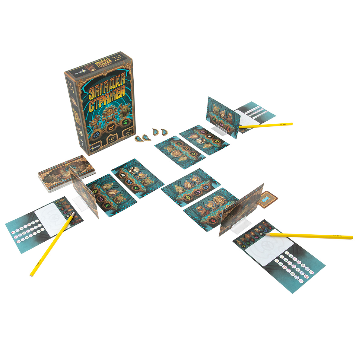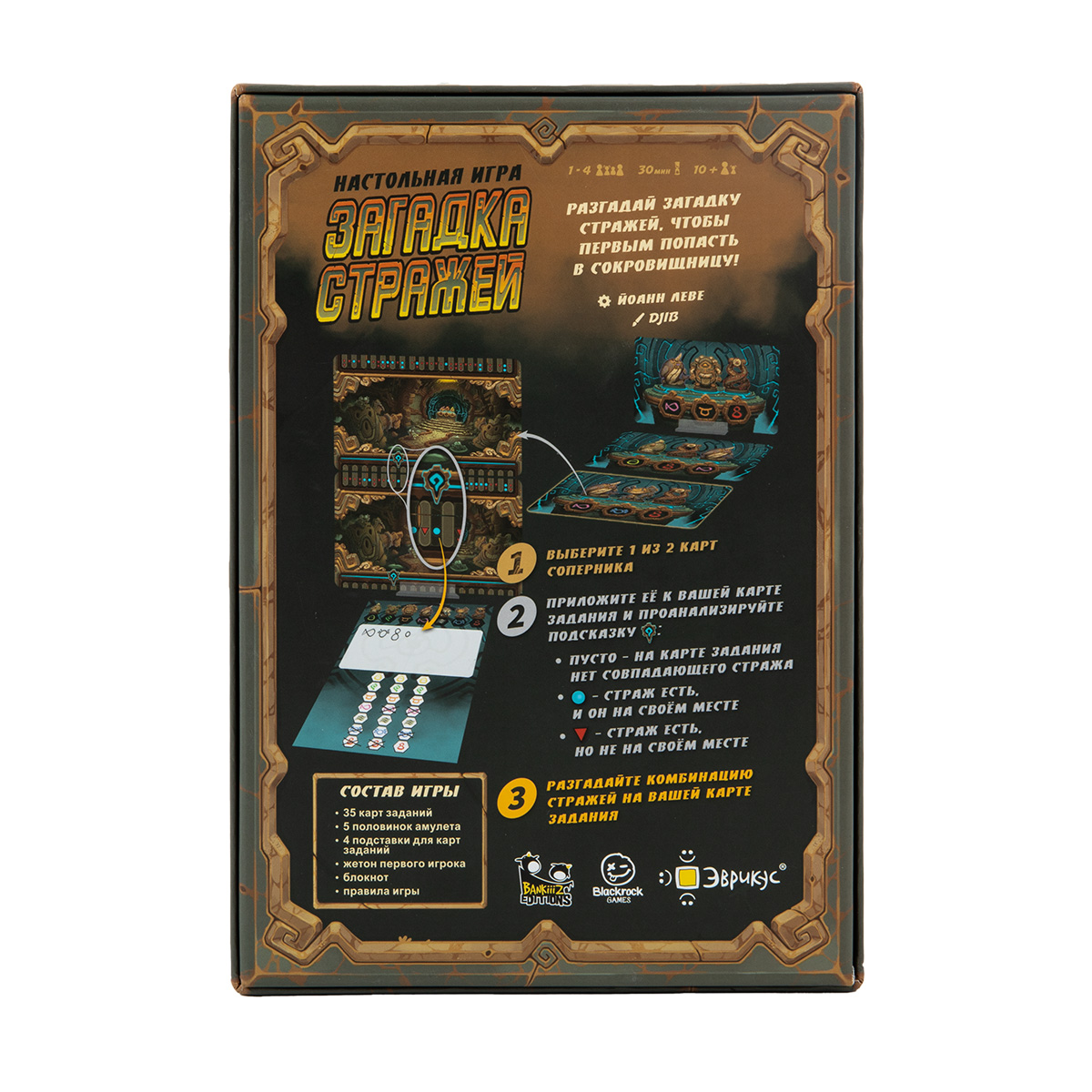 «Загадка стражей» – семейная логическая настольная игра, в которой вы отправляетесь на поиски сокровищ древнего храма, спрятанных за каменными стражами. Каждому участнику достаётся свой закрытый код – комбинация из трёх стражей, стоящих в определённом порядке, и именно эту последовательность предстоит восстановить с помощью подсказок и дедукции. Победителем станет тот, кто сумеет первым разгадать две разные комбинации и соберёт обе половины волшебного амулета, открывающего сокровищницу.