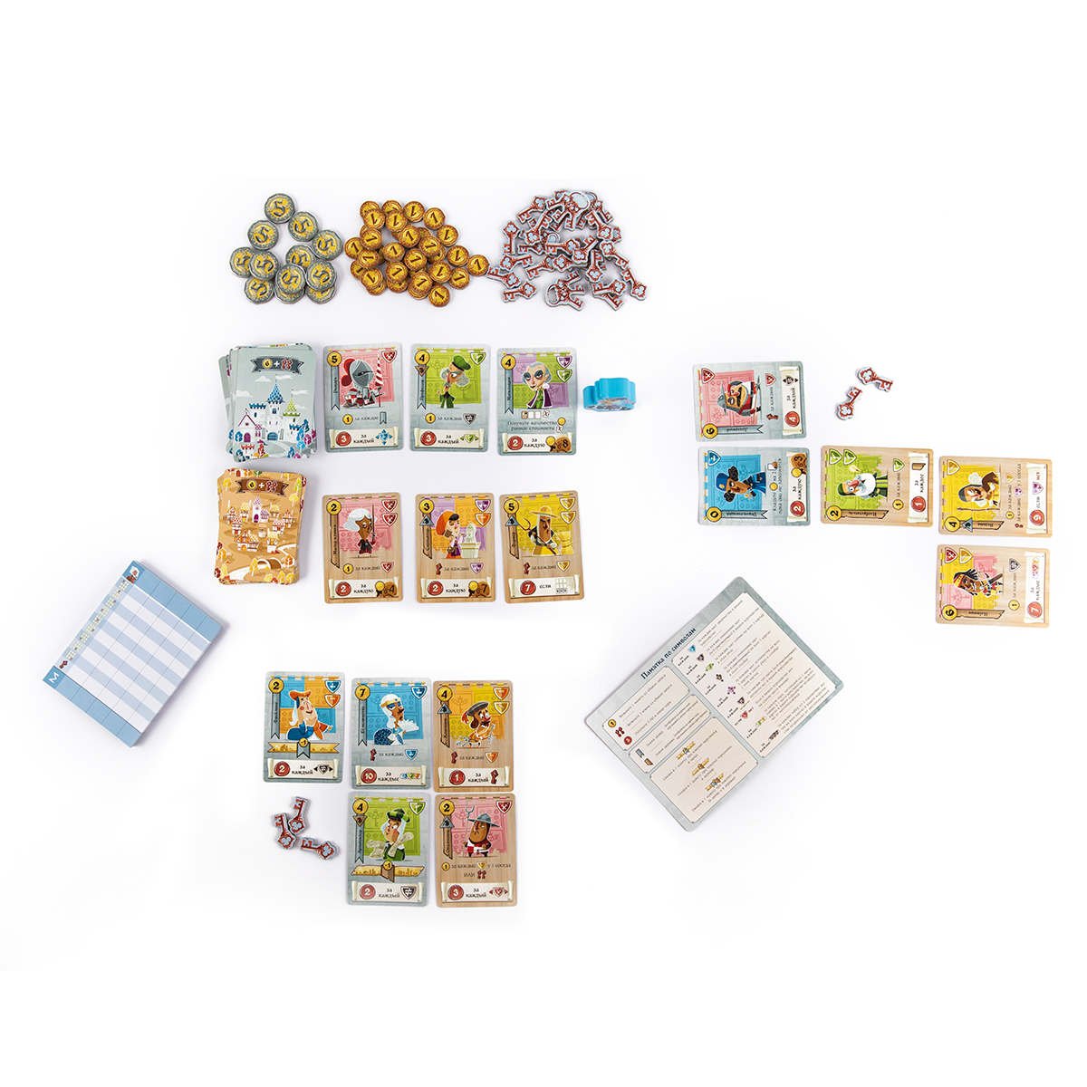 Все персонажи делятся на две области – замок и деревню. Деревенские жители обычно стоят дешевле или вовсе бесплатны, зато жители замка обойдутся дороже, но и приносят больше очков и сильные эффекты. На каждой карте указаны два типа информации: мгновенный или постоянный эффект, который помогает в течение партии (даёт монеты, ключи, скидки, доп.возможности), и условия начисления победных очков в конце игры. Правильный выбор направления – собирать ли, например, алхимиков и воров или ставку сделать на знать и рыцарей – определяет вашу стратегию.