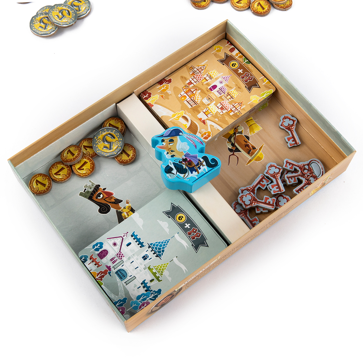 В центре стола лежат два рынка карт – «замок» и «деревня». Рядом с ними стоит фигурка герольда, показывающая, с какой областью сейчас можно работать. У каждого игрока есть немного монет и ключи – универсальный ресурс для манипуляций рынком. В течение партии вы будете тратить и пополнять монеты, покупать персонажей и выкладывать их в своё королевство, постепенно заполняя сетку 3×3.