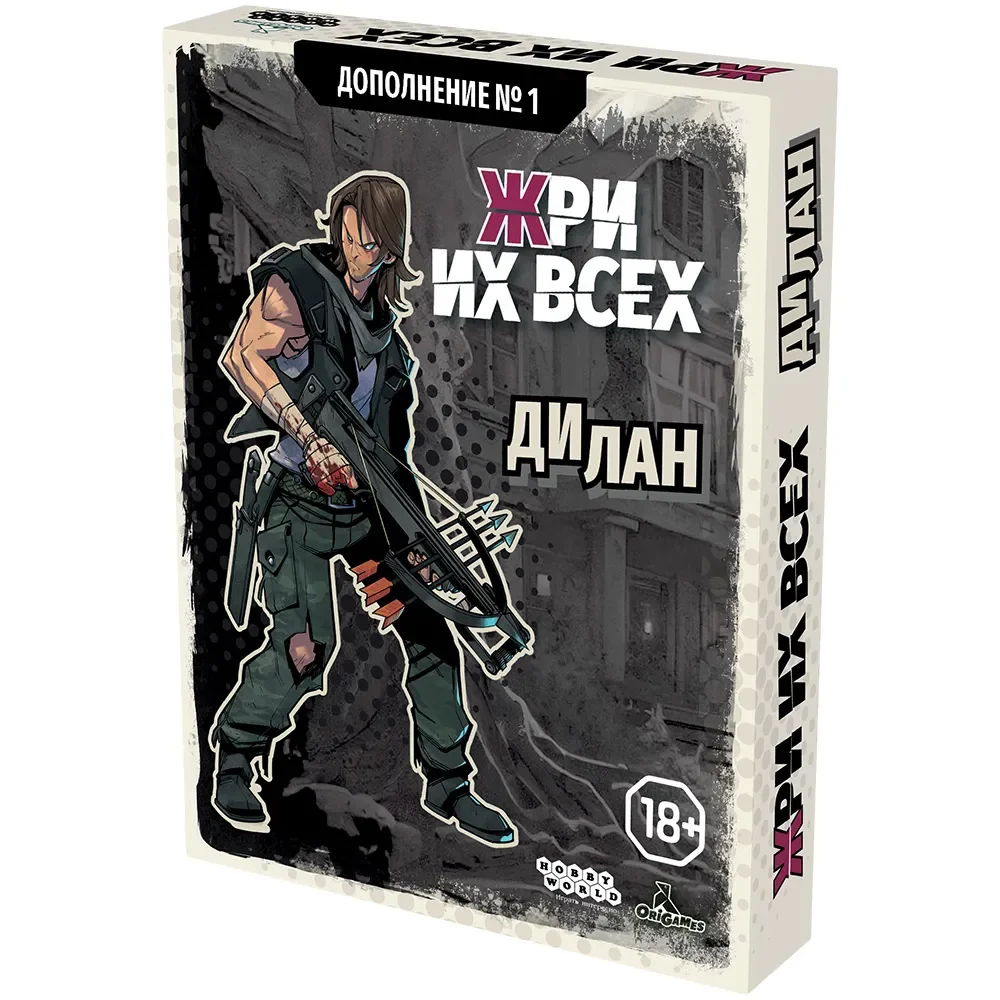 «Жри их всех: Дополнение №1. Дилан» — первое расширение к тактической игре про зомби «Жри их всех» (ранее издававшейся под названием «Ночной дожор»), которое усиливает сторону людей и делает жизнь орд мертвецов заметно сложнее. В центре внимания — новый персонаж‑выживший по имени Дилан, суровый на вид стрелок с арбалетом, готовый до последнего вздоха защищать остатки человечества. С вашей ордой он ещё не сталкивался, поэтому это отличная возможность проверить, насколько ваши зомби готовы к по‑настоящему серьёзному противнику.