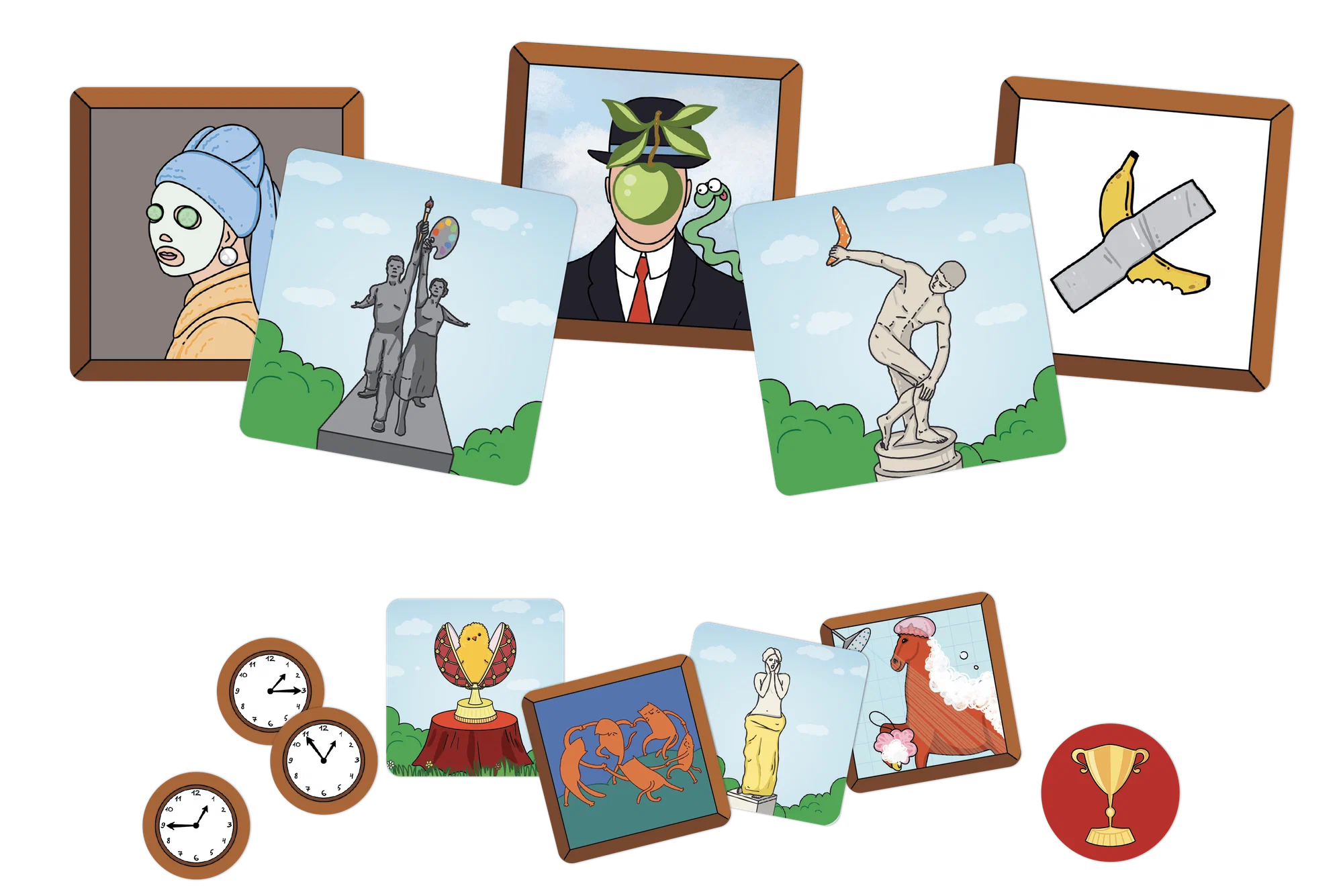 Каждая игра уникальна: карты экспонатов и подделки меняют расположение, эксперты дают разные подсказки, а жетоны времени создают переменный темп. Механика запоминания сочетается с дедукцией: нужно не только помнить увиденное, но и логически исключать настоящие предметы по подсказкам. Простые правила осваиваются за 2–3 минуты, а яркое поле с залами галереи и стилизованными экспонатами погружает в атмосферу детского приключения.