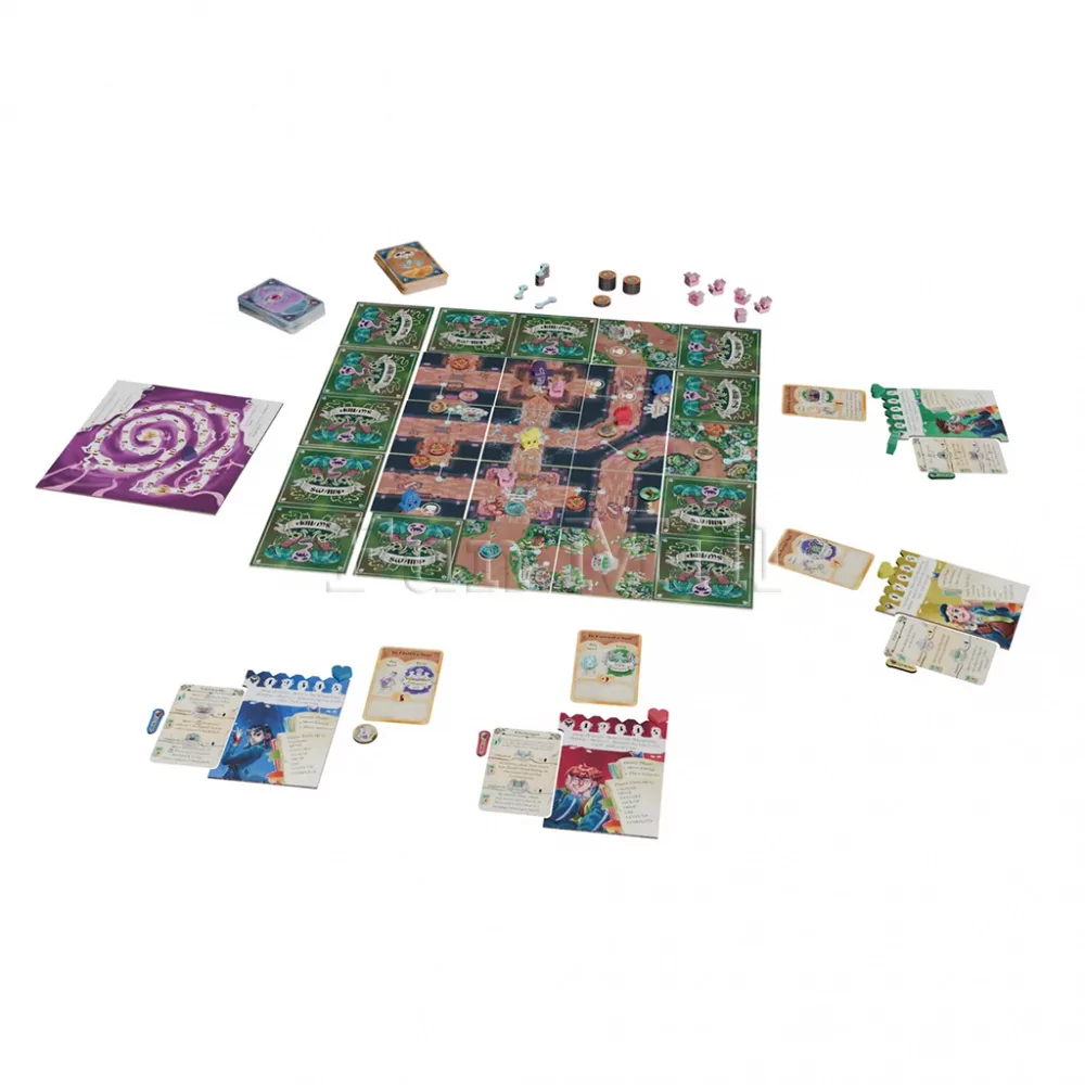 Игровое поле здесь не статично: оно состоит из 25 квадратных тайлов, из которых вы выкладываете академию и окружающее её болото. В начале партии видна лишь небольшая часть территории; по мере движения персонажей вы переворачиваете и открываете новые сектора, находите порталы, предметы и опасные зоны. Каждый тайл имеет свои особенности, а порталы соединяют отдалённые участки, позволяя строить хитрые маршруты и быстро перебрасывать учеников в нужные точки карты.